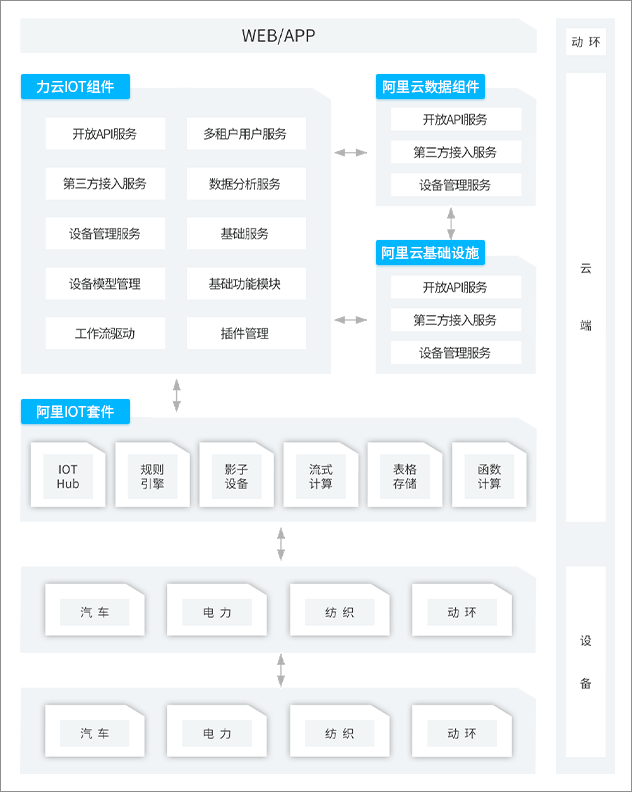 平台基于阿里IOT 套件提供快速集成的开发能力,通过标准物模型的驱动关联配置来连接各种异构设备,并结合大数据、AI、视频分析等能力,以标准服务模块或微服务的方式提供运营数据分析、功能展示、服务整合部署等能力。
